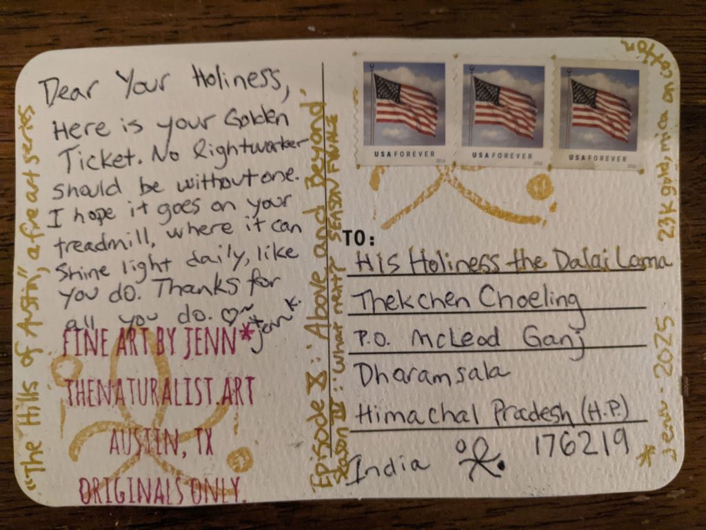 So, if by a longshot miracle this postcard reaches His Holiness, we will have secured a great living gem indeed. Each postcard is a node of light, all connected via love and pure hearts. I can see the net starting to really grow around this lovely planet Earth we call home. The Light Net.