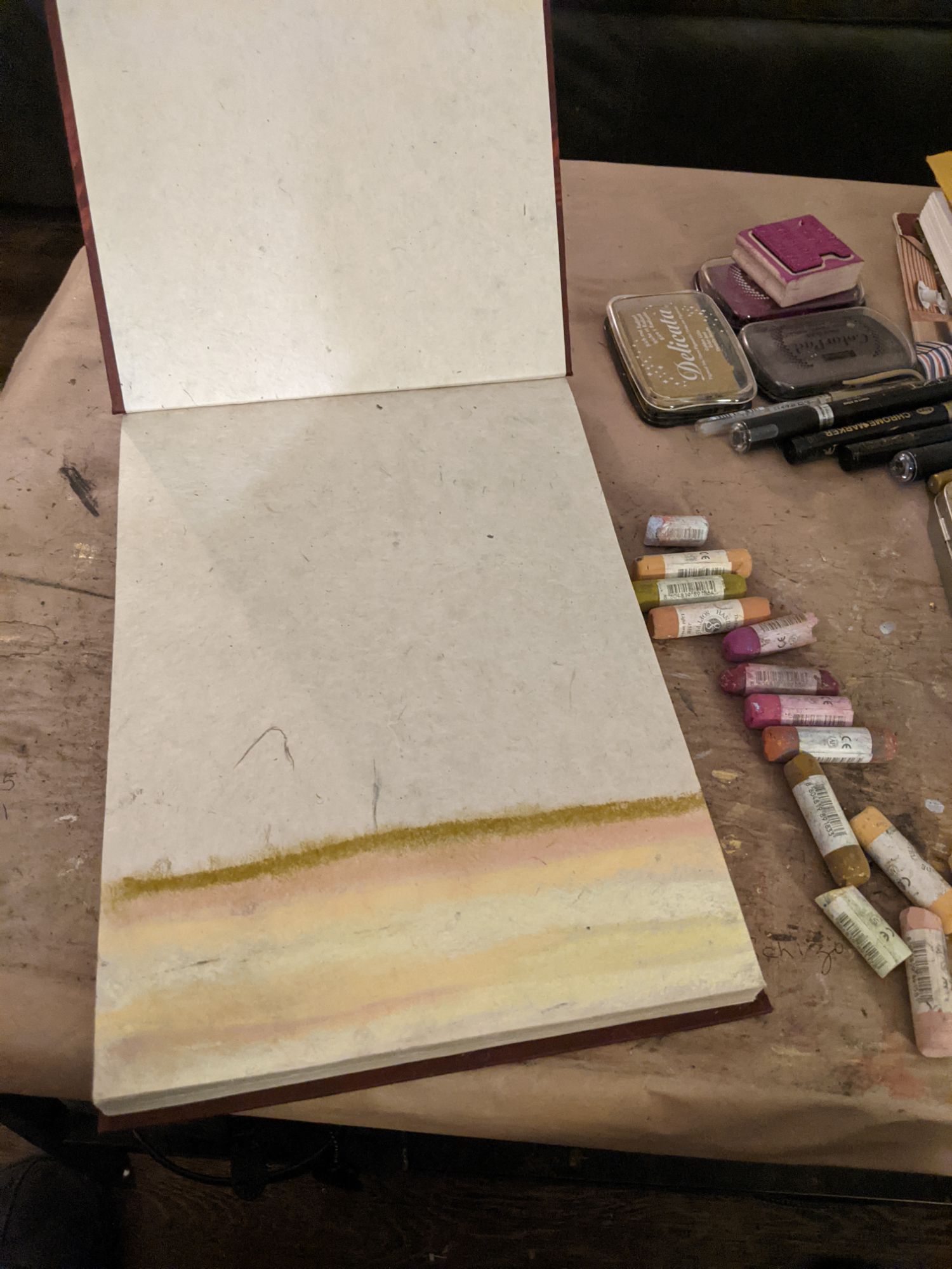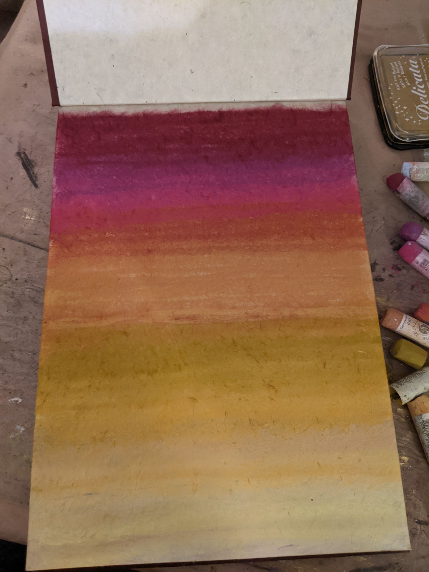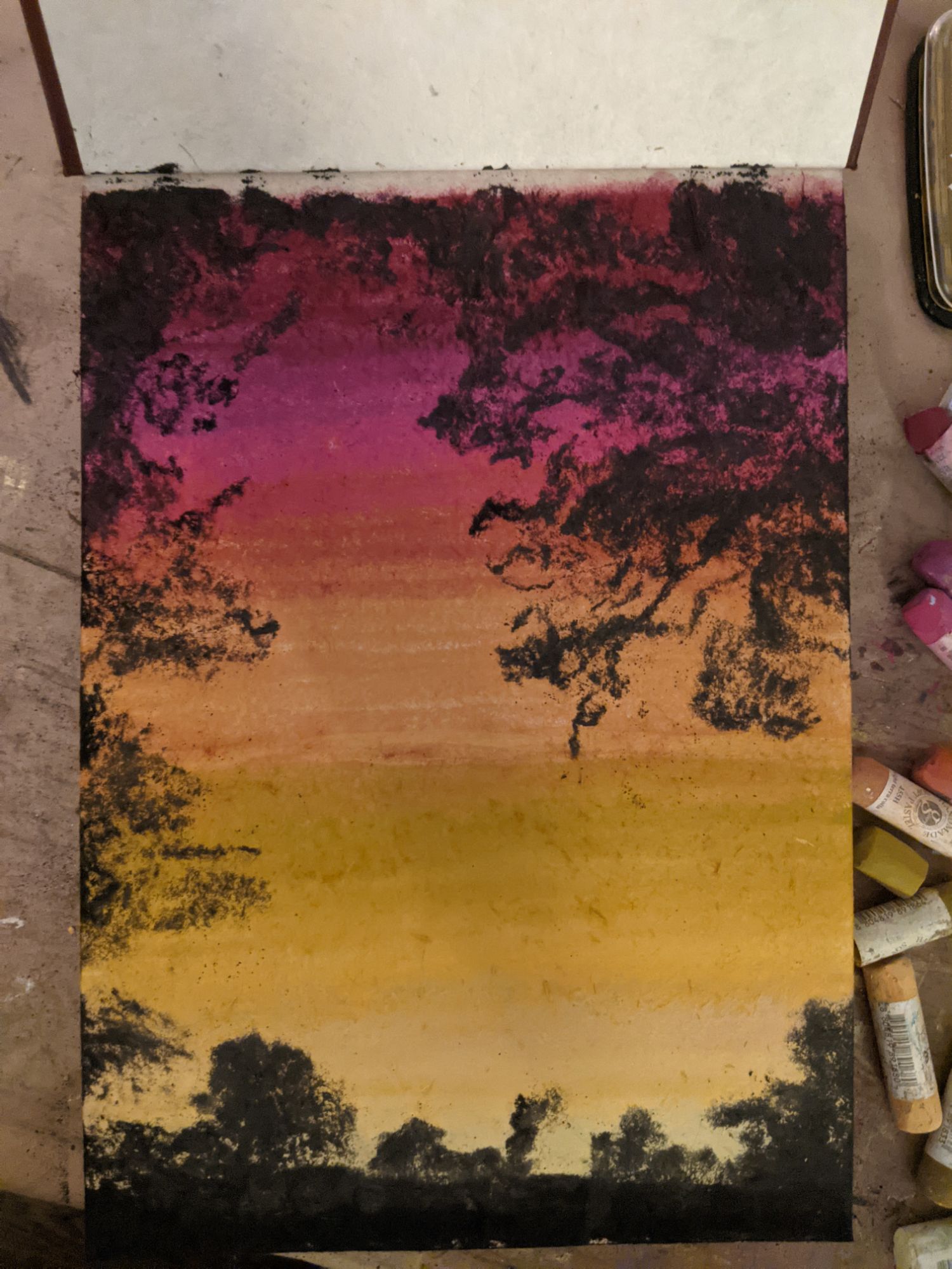 I thought these things, and then I felt helpless to summon the urge to study like that. Like I was done for as an artist- dried up, unmotivated, useless. Then a voice of my past self reminded me to carry on– “must keep creating”– so I pushed myself over the artistic ledge and created. Right there on the page. I did use my prior method of color-compare and brought up two pictures to work from, using a sunset captured by my mother the photographer in two moments that I conjoined into one scene.