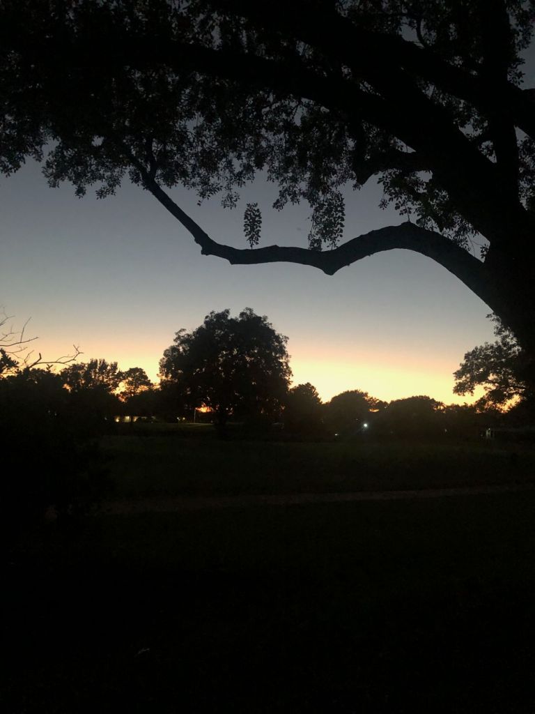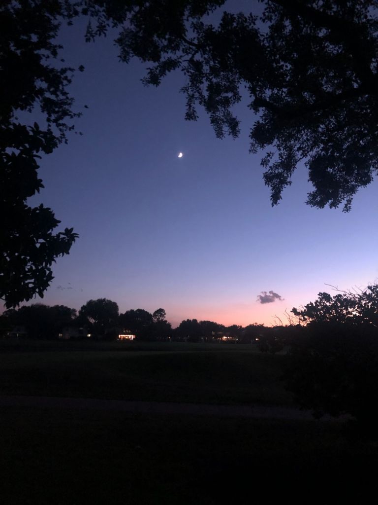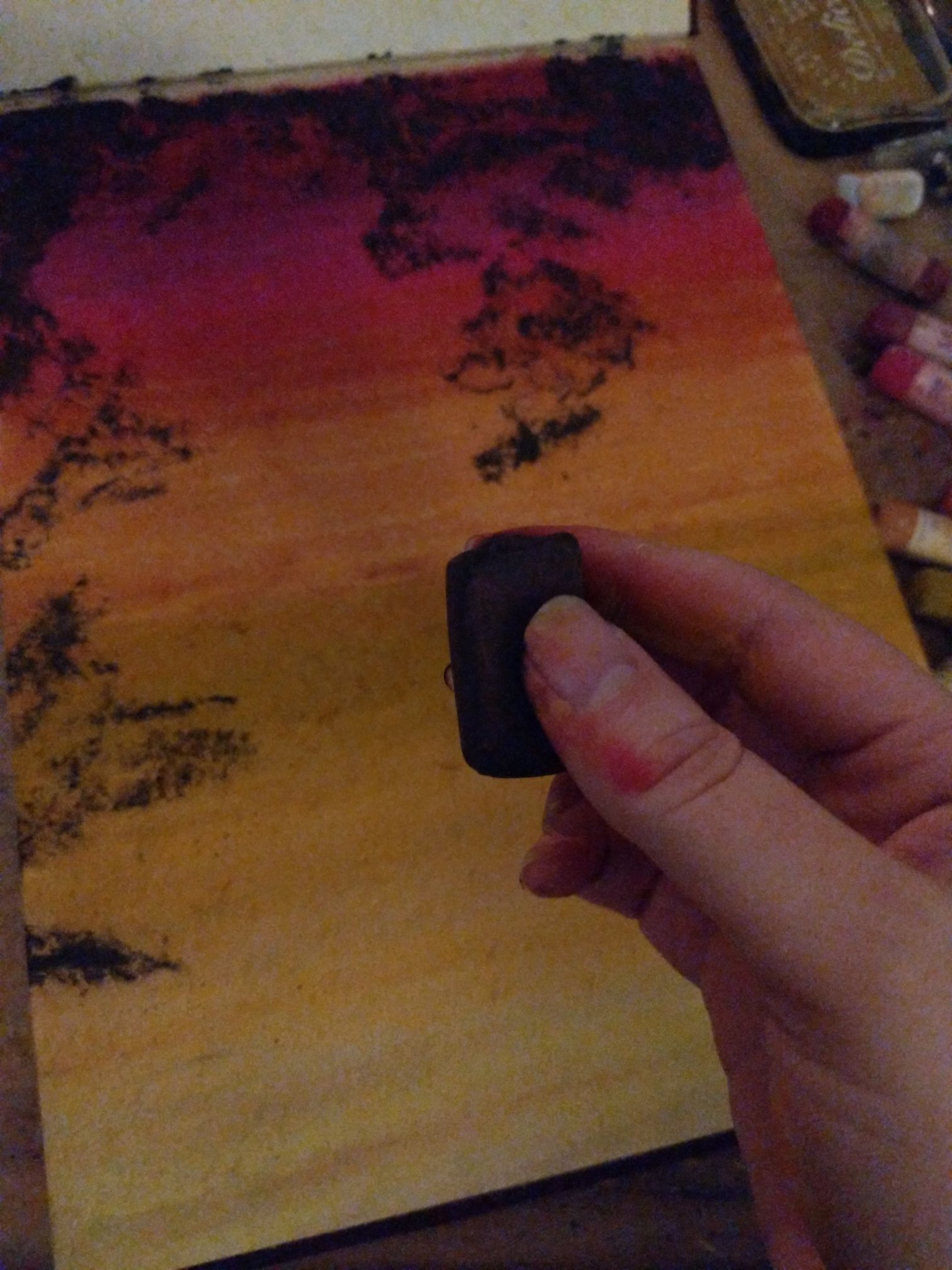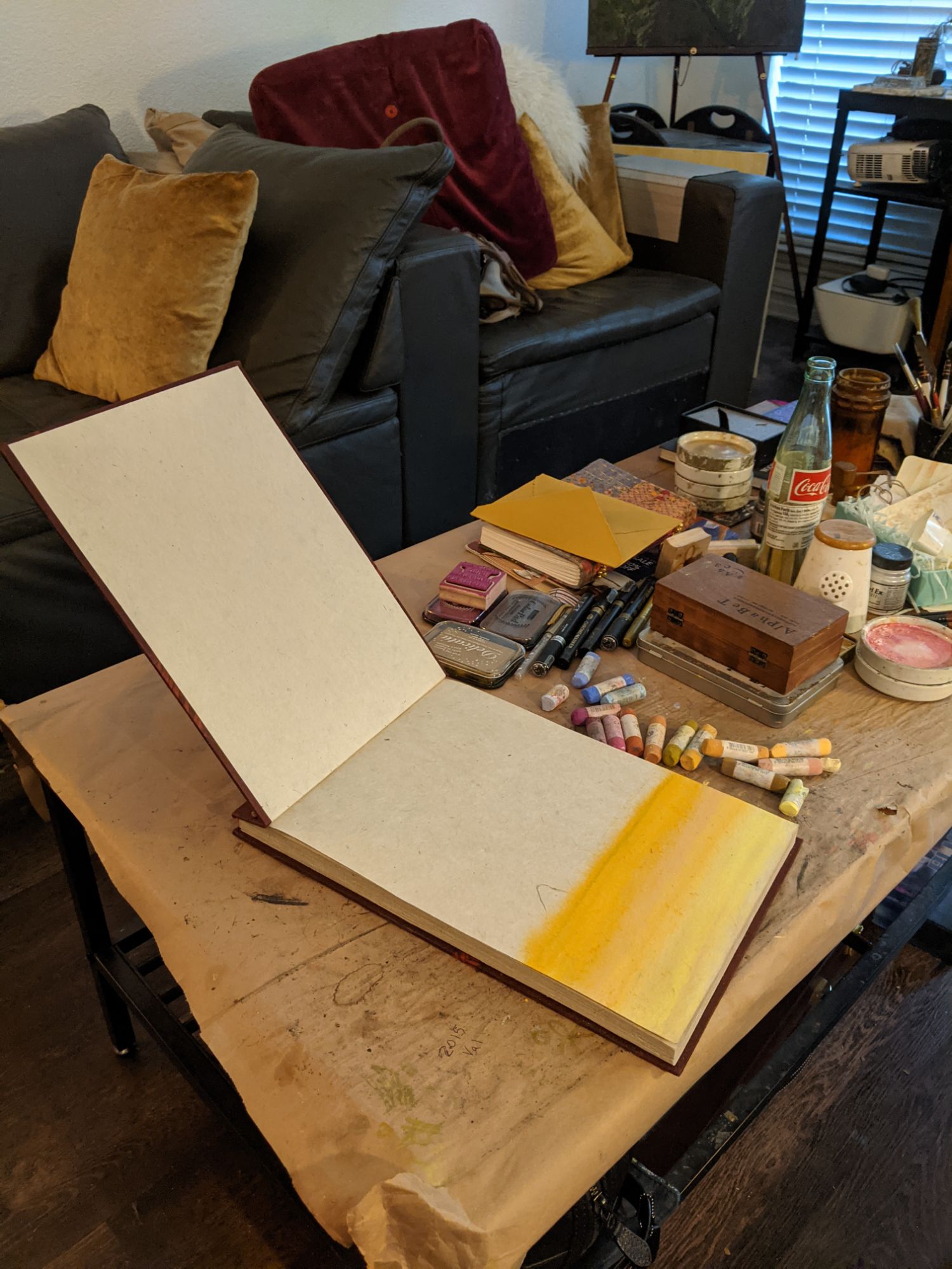 I thought these things, and then I felt helpless to summon the urge to study like that. Like I was done for as an artist- dried up, unmotivated, useless. Then a voice of my past self reminded me to carry on– “must keep creating”– so I pushed myself over the artistic ledge and created. Right there on the page. I did use my prior method of color-compare and brought up two pictures to work from, using a sunset captured by my mother the photographer in two moments that I conjoined into one scene.